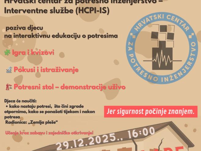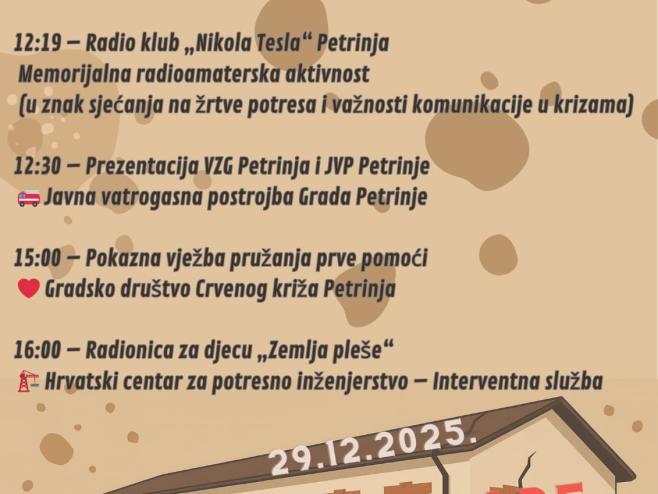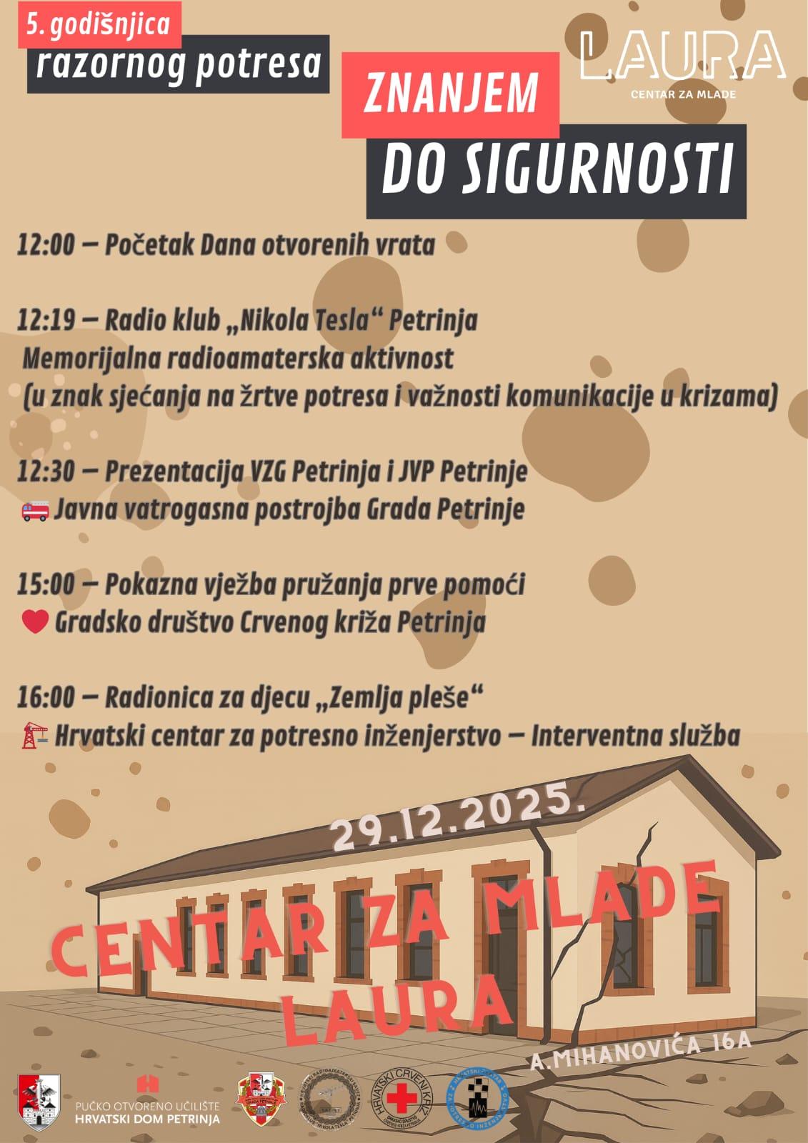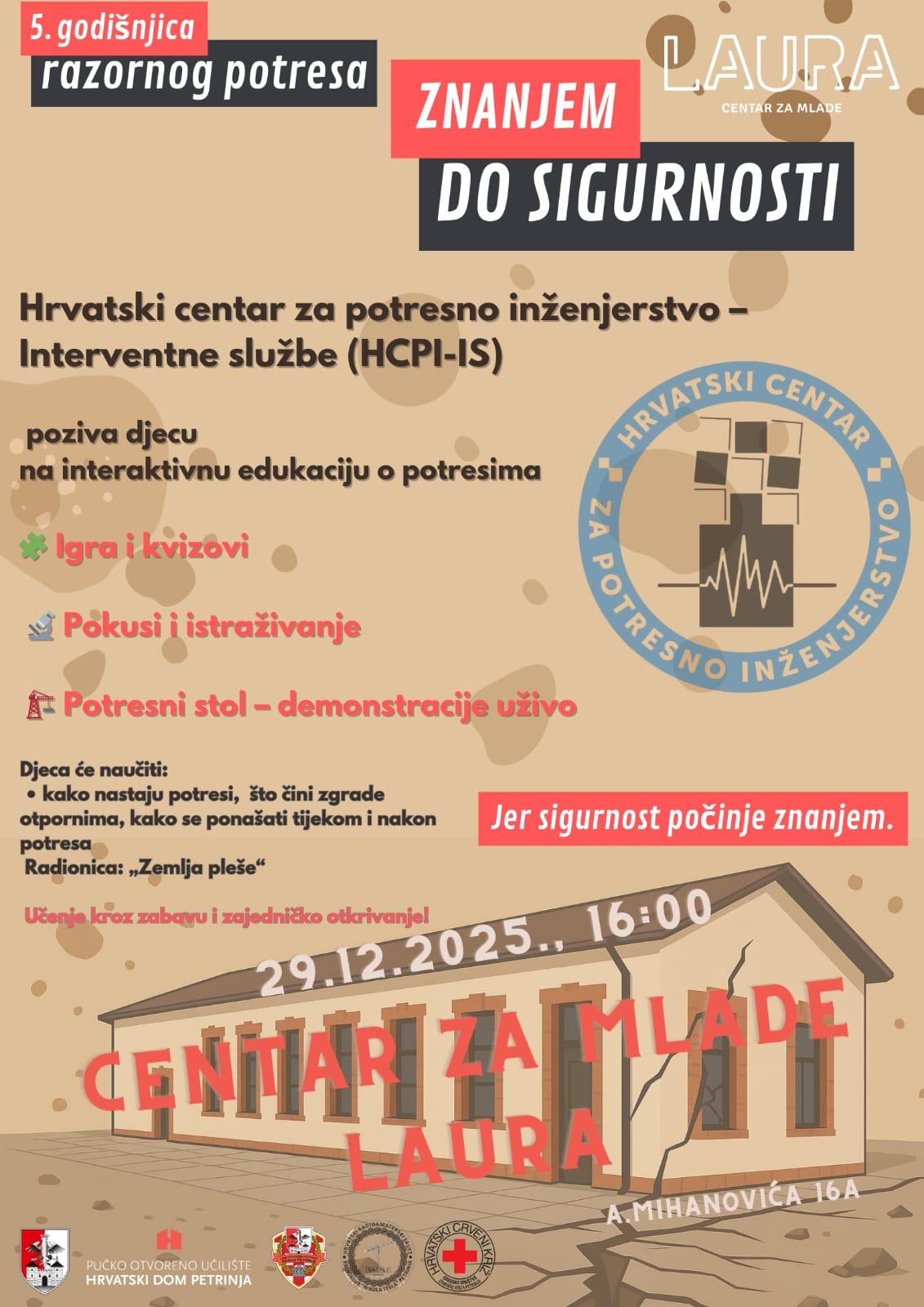 U poslijepodnevnim satima, fokus se prebacuje na budućnost i edukaciju: od 16:00 do 18:00 sati, u Centru za mlade „Laura“ u Petrinji (Ul. Antuna Mihanovića 16A), održat će se edukativna radionica za djecu „Zemlja pleše“. Kroz igru, kvizove i pokuse na potresnom stolu, najmlađi će učiti o potresima, sigurnosti i otpornosti zgrada, potičući znatiželju i osjećaj sigurnosti od najranije dobi.